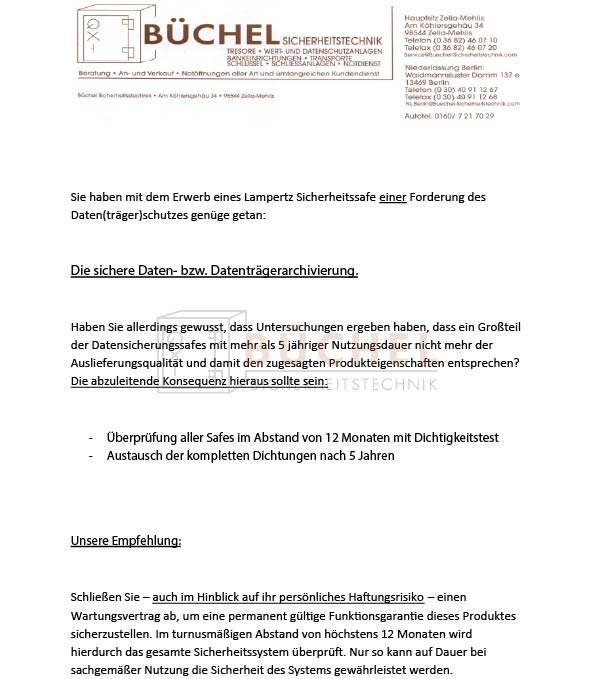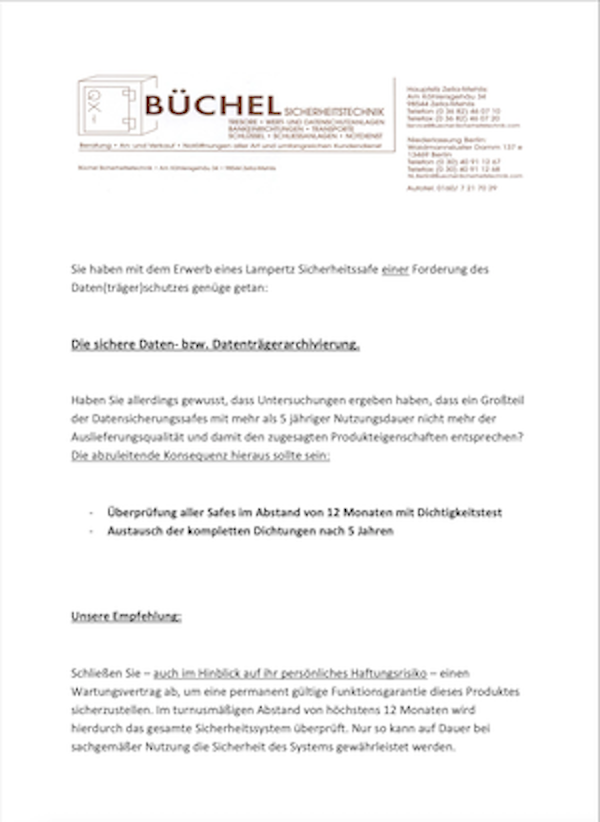 Minimieren Sie Ihr Haftungsrisiko. Schließen Sie einen Wartungsvertrag ab, um eine permanent gültige Funktionsgarantie für Ihre Datensafes sicherzustellen.